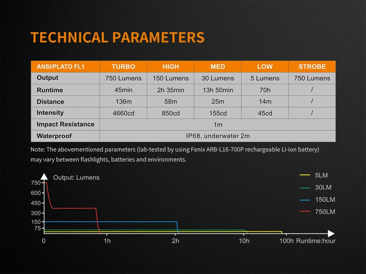 • Turbo: 750 lumens/45 min. (446 ft./136 meters)