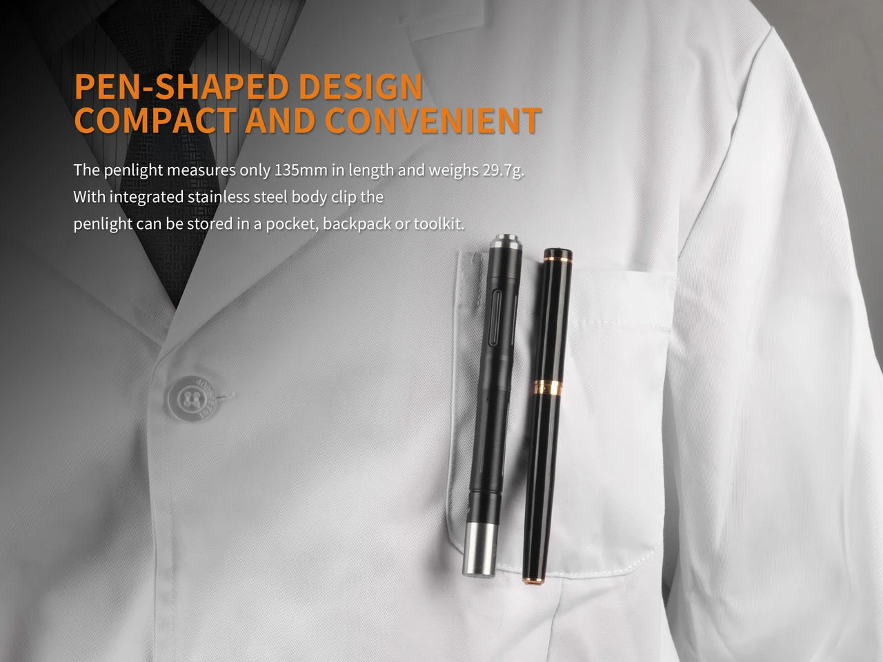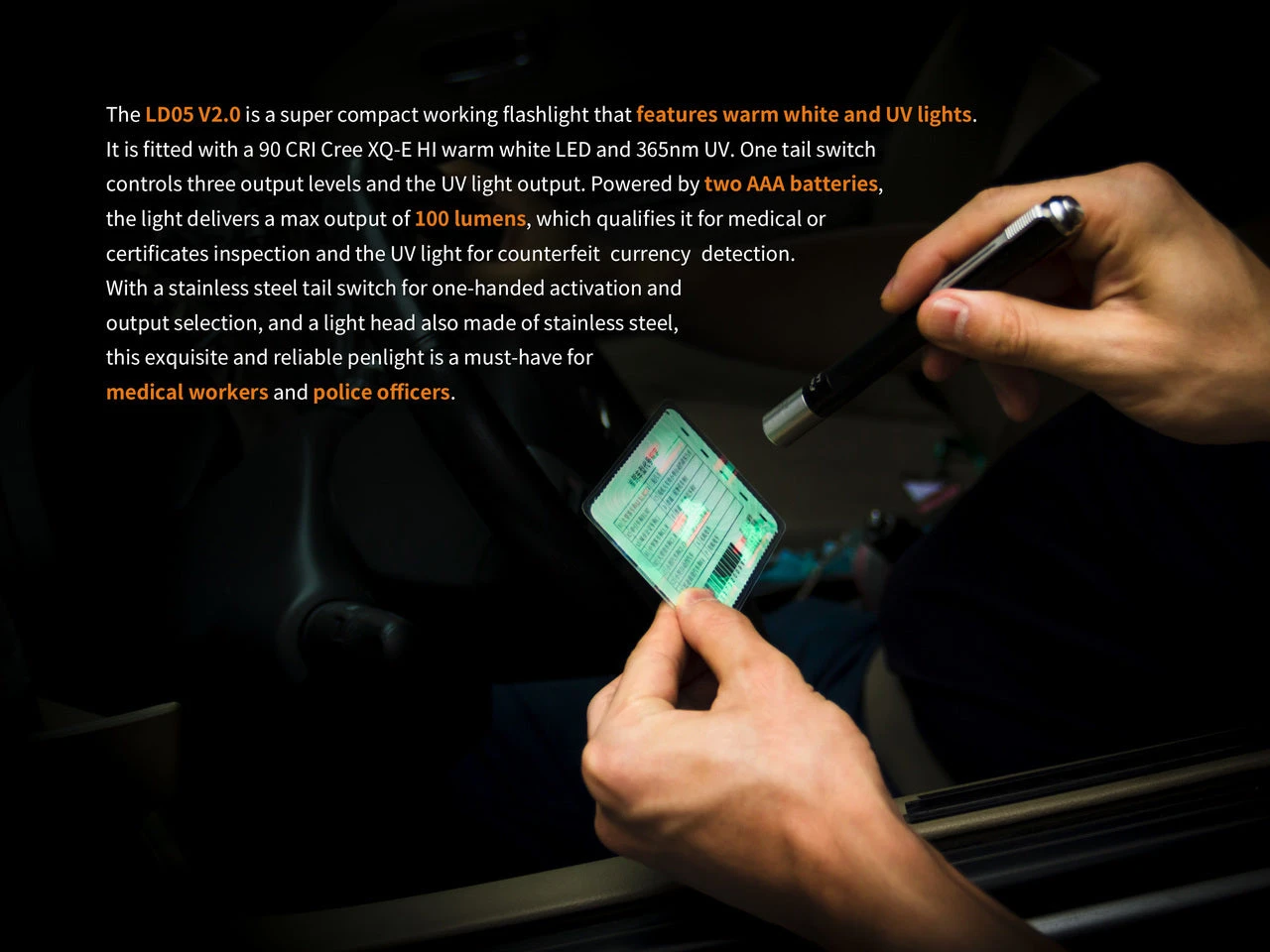 The Fenix LD05 V2.0 EDC Penlight is a easy to use dual lighting source penlight with warm white light and UV lighting also. The all new Fenix LD05 V2.0 uses a 90 CRI CREE XQ-E HI LED and a 365nm UV LED. Operating the Fenix LD05 is simple, the stainless steel tail switch controls all three warm white light outputs and the UV light output. A single click turns the Fenix LD05 on, and half clicks allows you to increase the outputs. The Fenix LD05 V2.0 is powered by two AAA batteries which deliver an amazing 100 Lumens of output. This light is perfect for doctors and dentists as well as helps with medical inspections in low-light areas. The powerful UV light also provide easy detection of counterfeit currency. Get your Fenix LD05 V2.0 today!