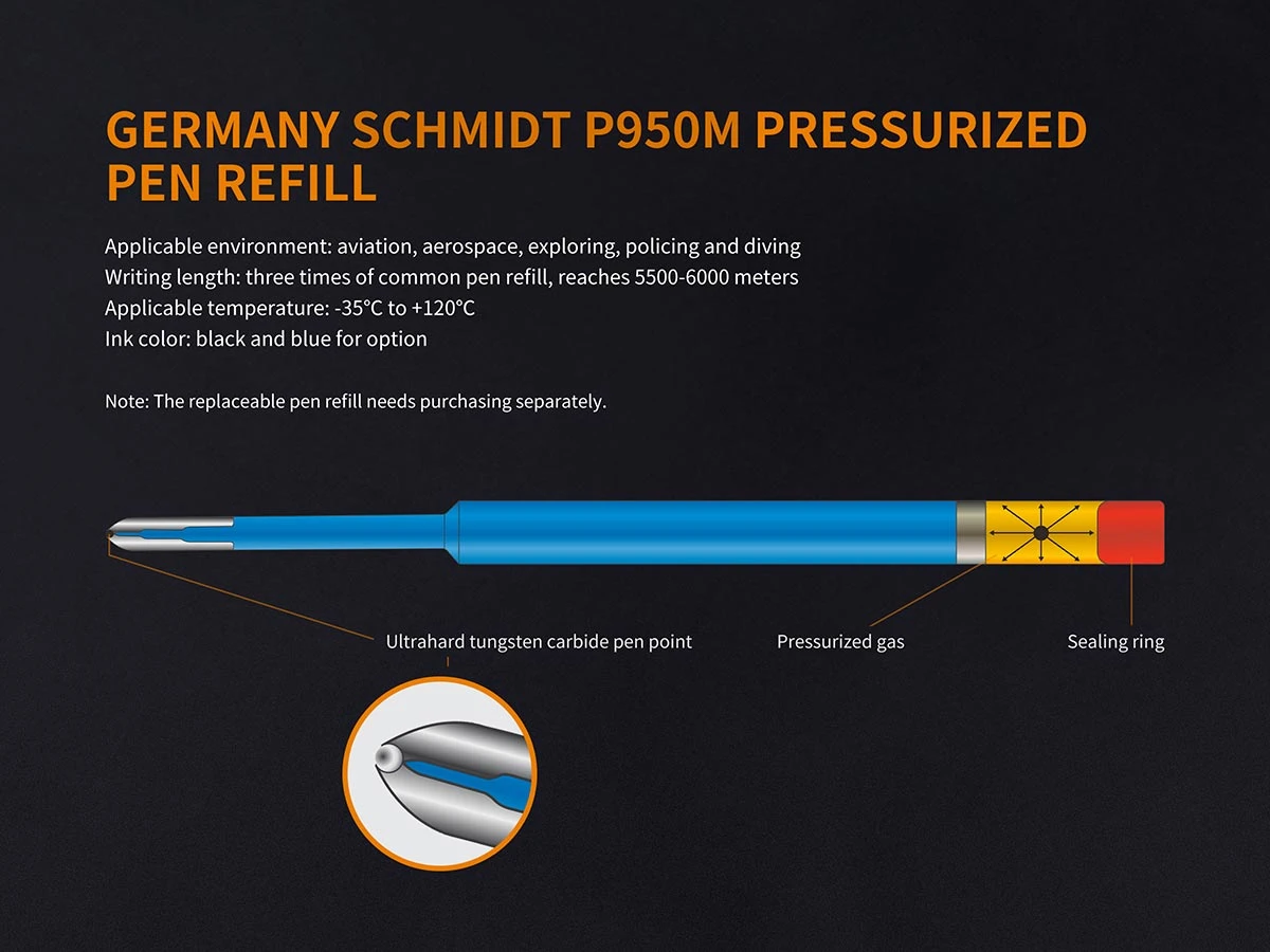 The Fenix Halberd T5Ti Titanium Tactical Pen is not only an exquisite writing instrument, but it’s also designed to be used in tactical situations. First and foremost, a tactical pen should be a great for writing, and with its German SCHMIDT® P950M pressurized refill, this pen performs this task perfectly—even underwater. The pen’s body is made of TC4 Titanium alloy with a hardened steel strike bezel which makes it strong enough to handle any emergency, self-defense, or tactical challenge. Lightweight with elaborate CNC machining, the Fenix Halberd T5Ti Titanium Tactical Pen will become your favorite pen to use every day or to give as a gift— even for the most discerning pen aficionado.