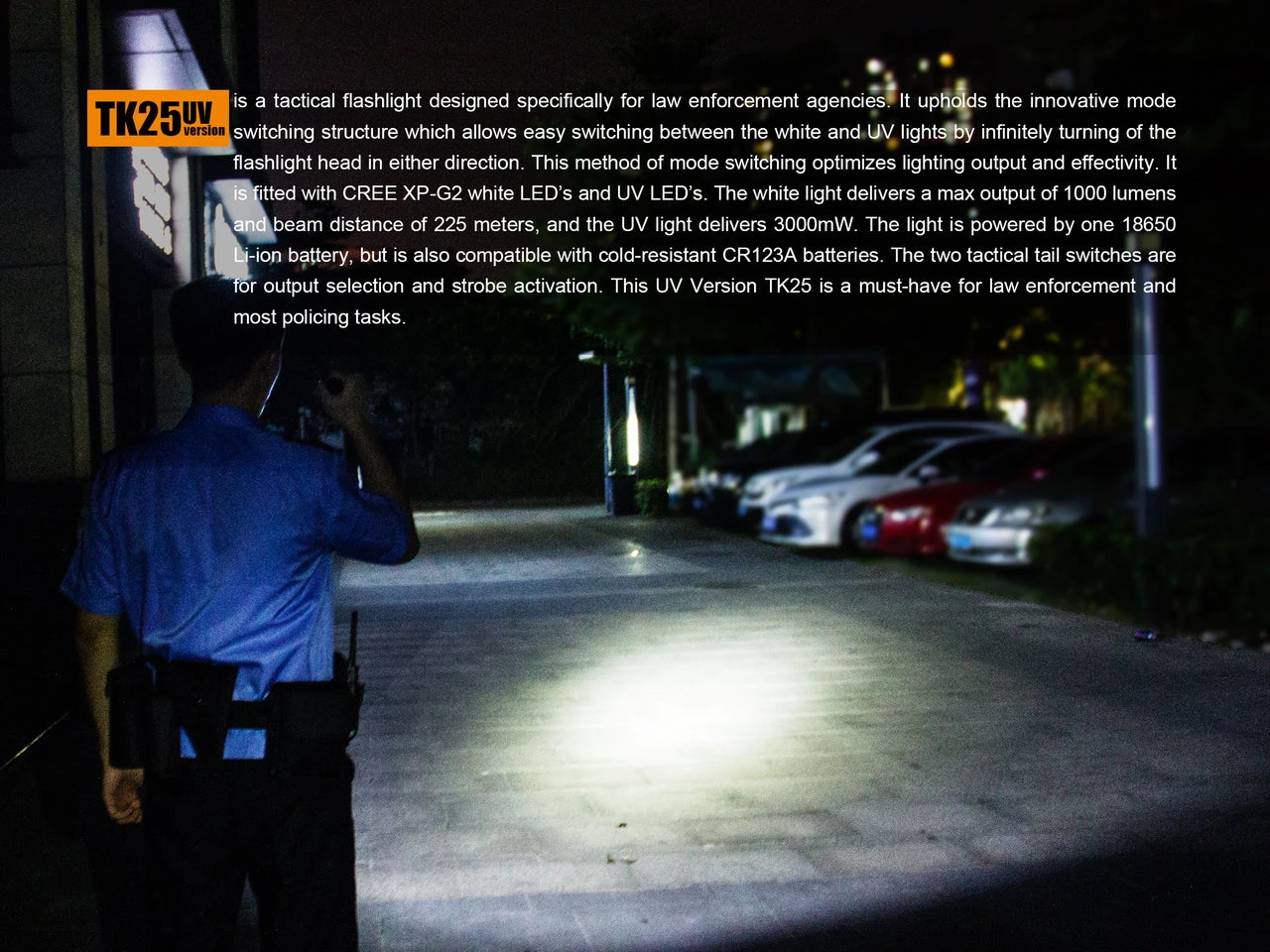 The Fenix TK25UV is a powerful Law Enforcement (LEO) flashlight with a max of 1000 lumens of white light and 3000 mW of ultraviolet light. It combines an innovative mode switching structure to switch between the the white LED light and the UV light. To change modes, simply turn the head of the TK25UV flashlight in either direction. The ultraviolet light has a multitude of uses, most importantly in anti-counterfeit authentication. An added feature of the TK25UV light is the dual tactical switch, which makes turning the light on and off effortlessly. Momentary on is activated by tapping the on and off switch. The functional switch which is located directly below the on/off switch allows you to increase the outputs to 15 lumens, 100 lumens, 300 lumens, and 1000 lumens. As is with most Fenix tactical flashlights, the TK25UV light is IP68 rated, submersible underwater for 30 minutes up to 2 meters or 6.5 ft. Other standard features include an easy carry pocket clip and ultra-clear glass lens with anti reflective coating. The Fenix TK25UV is the perfect light for any tactical team or police department.