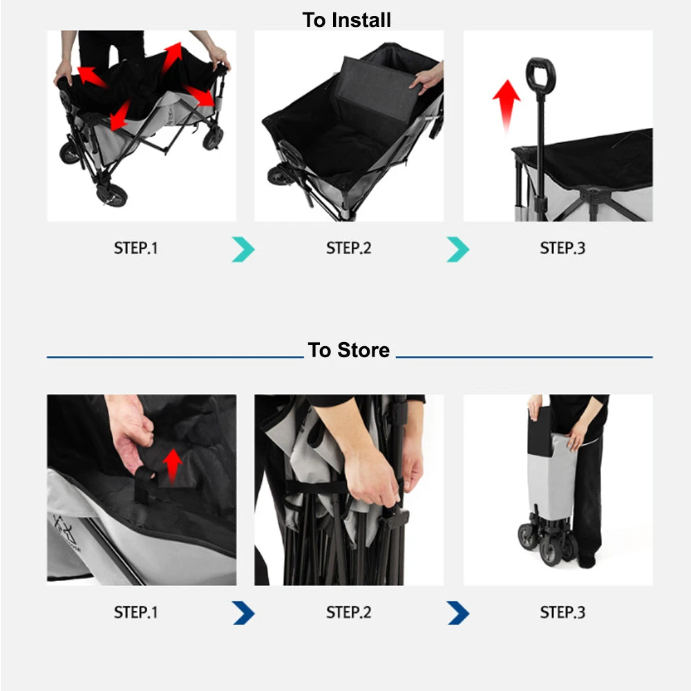 The pelican wagon is a heavy-duty frame structure and a sturdy polyester body that can easily carry heavy loads. It can be used generously with a capacity of about 160L, and the one-touch folding system makes storage and installation easy. The wagon can be used anytime, anywhere with thick wheels made of PVA material. The folding system allows for easy storage in a small space and can be safely stored in a dedicated carry bag.