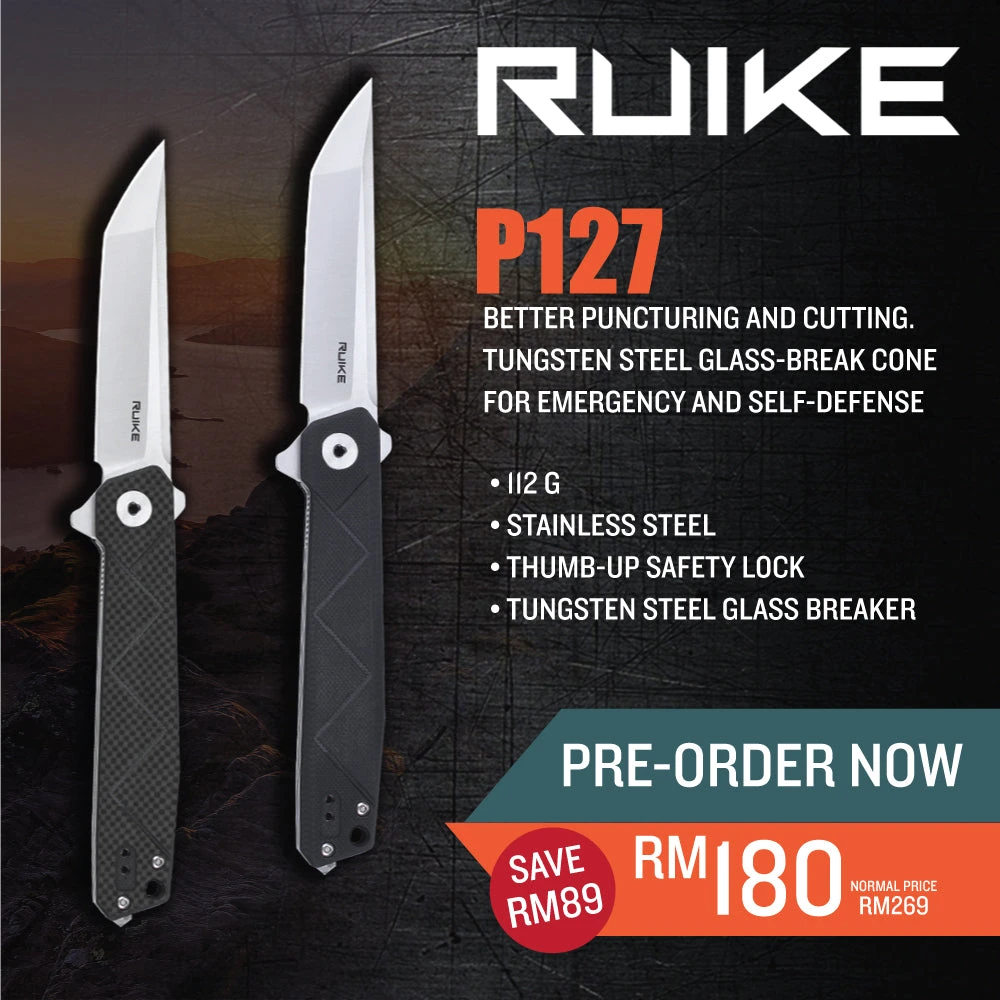 The P127-B is designed to offer better puncturing and cutting ability with its finely flat ground tanto blade. A tungsten steel glass-break cone on the end of the handle will be helpful in emergency or self-defense