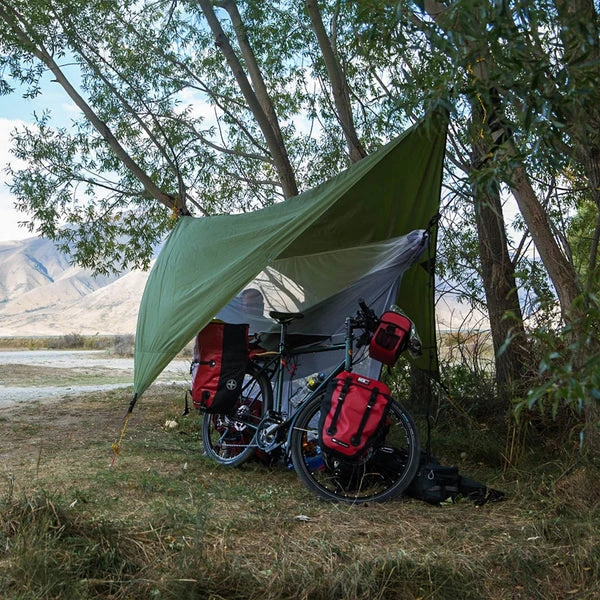 The MoonTarp is designed to be used with all Ticket To The Moon hammocks (except the Mammock), but it can also be used alone or with most other hammocks. It measures 350 cm x 350 cm and covers 12m² of surface. It is made of nylon Ripstop treated PU which ensures an effective protection against the weather (Waterproof2000 mm). For better protection, it has ergonomic drip lines. This tarp is simple and quick to put in place thanks to its 8 points of inking (shrouds and aluminum buckle.